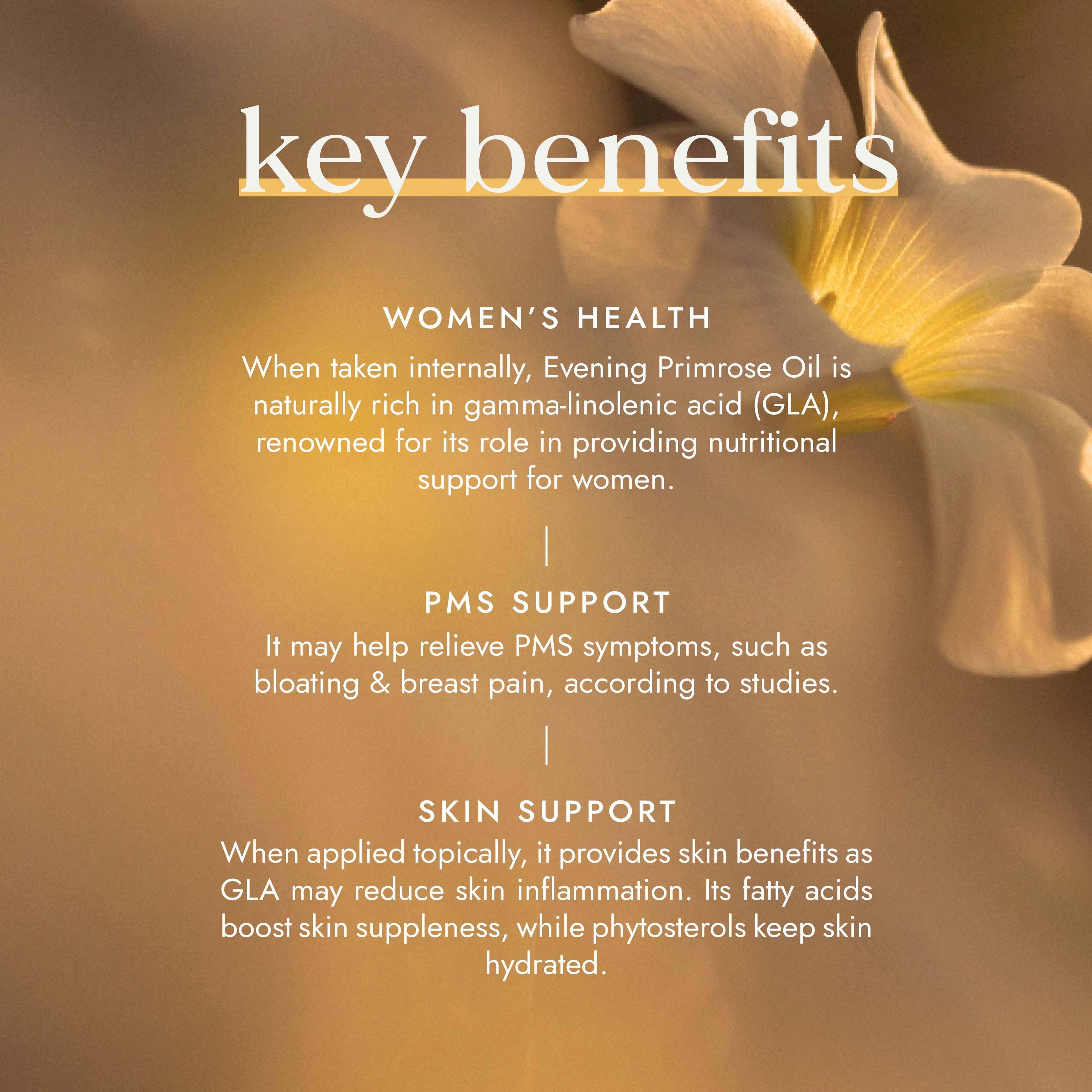 TARGETS: Internal & external health - Anti-ageing, GLA, Omega 6 & PMS symptoms.