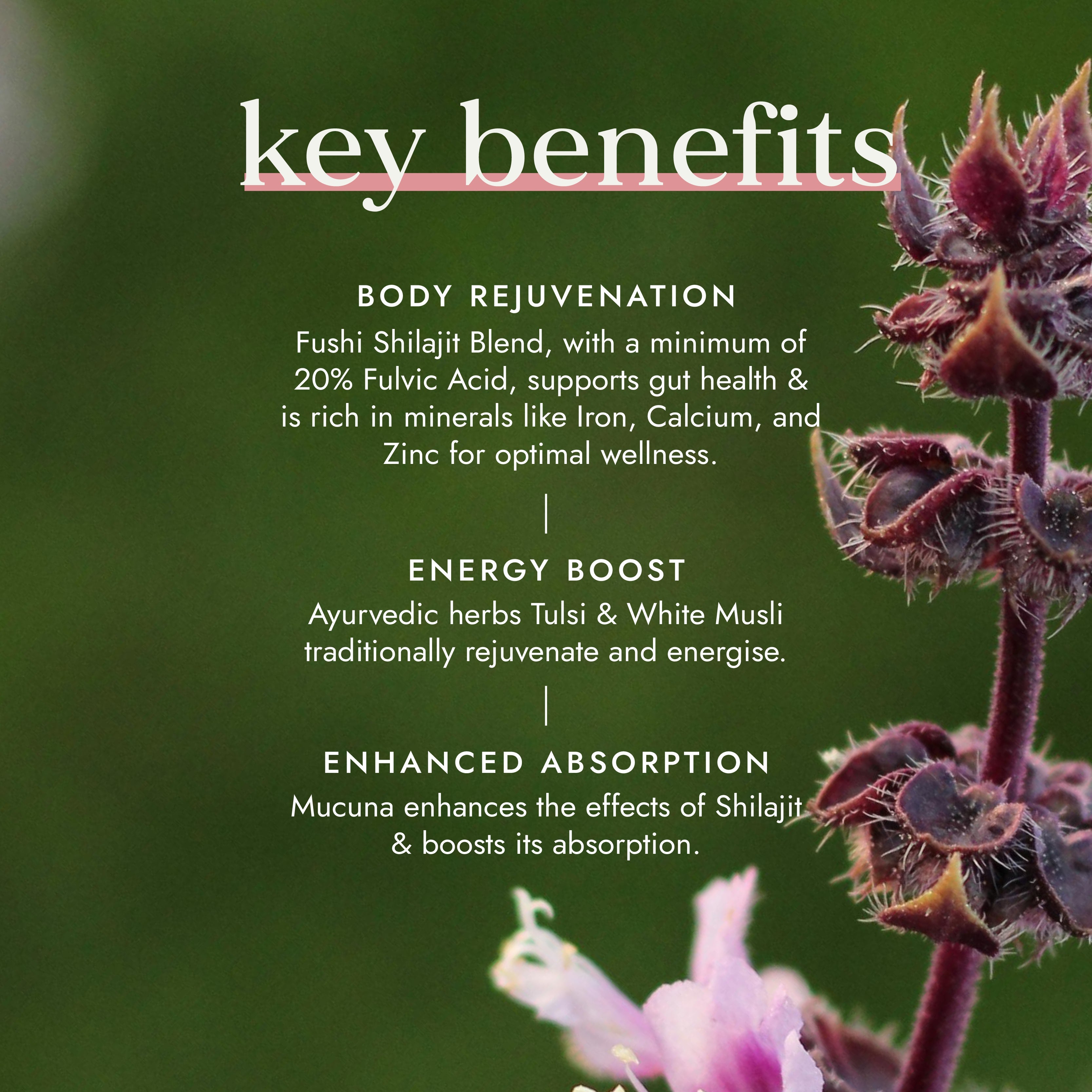 KEY INGREDIENTS: High-strength Fresh-Ground® Shilajit, with 20% Fulvic Acid minimum & Fresh-Ground® Tulsi, Kapikachhu and White Musli herbs.