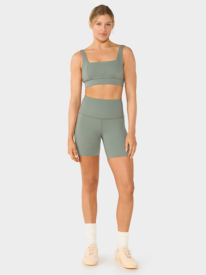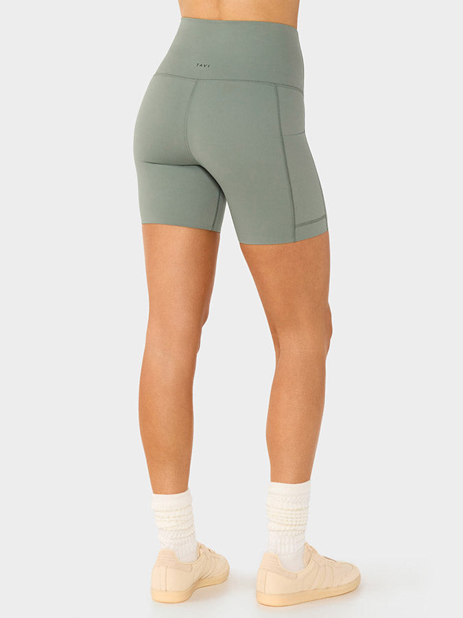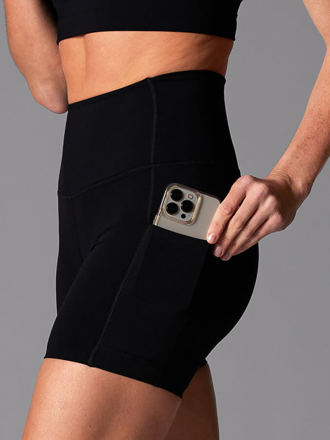 Our signature bike short keeps improving. This time, with a slightly shorter inseam for those who prefer to go short with their shorts. Designed for movement with sweat-wicking and quick-dry fabric. Features our signature TaviSculpt™ fabric, lifts smooths, and flatters. It delivers compression in all the right places, so you can look and feel good on and off the mat. Features dual side pockets.